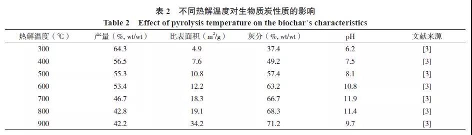 一般來說在熱解過程中隨著溫度的升高,生物質(zhì)炭的產(chǎn)量會(huì)逐漸降低、生物質(zhì)炭的比表面積和孔隙結(jié)構(gòu)會(huì)變得更加豐富。已有研究表明,污泥生物質(zhì)炭的產(chǎn)量由300 ℃時(shí)的64.3%(wt/wt)下降到900 ℃時(shí)的 42.2%(wt/wt);而比表面積由300 ℃時(shí)的4.9 m2/g 增加到900 ℃時(shí)的34.2 m2/g (表2)。生物質(zhì)炭表面的-COOH、-COH 和-OH 等含氧官能團(tuán)逐漸增多,由此產(chǎn)生的表面負(fù)電荷使得生物質(zhì)炭具有較高的陽離子交換量(CEC)。熱解溫度越高,生物質(zhì)炭的pH 越高,這是由于熱解過程中會(huì)產(chǎn)生大量灰分,其中的礦質(zhì)元素溶于水后呈堿性所致。