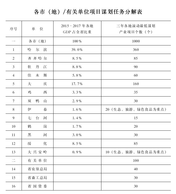 3.落實(shí)產(chǎn)業(yè)項(xiàng)目謀劃任務(wù)。堅(jiān)持產(chǎn)業(yè)項(xiàng)目謀劃與各地經(jīng)濟(jì)規(guī)模相匹配原則,哈爾濱、大慶、齊齊哈爾、牡丹江、佳木斯、綏化等主要城市在項(xiàng)目謀劃上要有更大擔(dān)當(dāng),更好的發(fā)揮省會(huì)城市示范作用、釋放中心城市帶動(dòng)作用,激活周邊區(qū)域要素,促進(jìn)區(qū)域協(xié)同發(fā)展。資源型地區(qū)要強(qiáng)化轉(zhuǎn)型發(fā)展,煤城突出現(xiàn)代煤化工和非煤替代產(chǎn)業(yè)項(xiàng)目謀劃工作,林區(qū)突出生態(tài)旅游、林下資源開(kāi)發(fā)、綠色有機(jī)食品等項(xiàng)目?jī)?chǔ)備。沿邊地區(qū)要發(fā)揮地緣優(yōu)勢(shì),突出開(kāi)發(fā)外向型產(chǎn)業(yè)項(xiàng)目。按照各地2015年至2017年經(jīng)濟(jì)總量占全省的比重,并考慮各地間的適度均衡,確定各地三年謀劃產(chǎn)業(yè)項(xiàng)目最低目標(biāo),鼓勵(lì)各地超額完成任務(wù)。