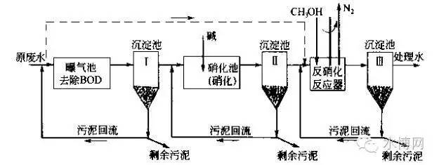 (1)活性污泥法傳統(tǒng)流程這是一種傳統(tǒng)的三級生物脫氮工藝,即有機物的氧化、硝化和反硝化作用分別在不同的構(gòu)筑物中完成,如下圖所示:
