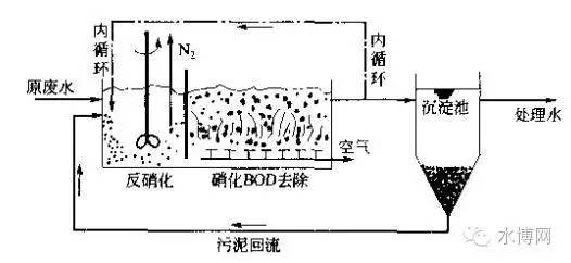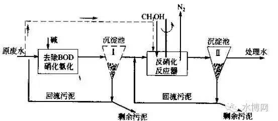 如果將有機物去除和硝化放在同一個反應器中進行,而將反硝化作用放在另一個反應器中進行,則可以將三級生物脫氮系統(tǒng)簡化為兩級生物脫氮系統(tǒng)。如下圖: