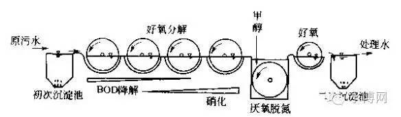 該工藝的脫氮原理是:由于降解有機物的好氧氧化菌的生長繁殖優(yōu)先于硝化菌與亞硝化菌,因此,在前兩級轉(zhuǎn)盤上去除有機物的能力較強,而后兩級能夠產(chǎn)生比較充分的硝化反應,形成硝酸鹽氮和亞硝酸鹽氮。由于轉(zhuǎn)盤低速旋轉(zhuǎn)的傳質(zhì)作用.這些硝態(tài)氮隨污水進人處于厭氧狀態(tài)的淹沒式轉(zhuǎn)盤時,與外加甲醇充分接觸,進行反硝化脫氮反應。而殘留下來的甲醇再經(jīng)過好氧生物轉(zhuǎn)盤的處理后得到去除。