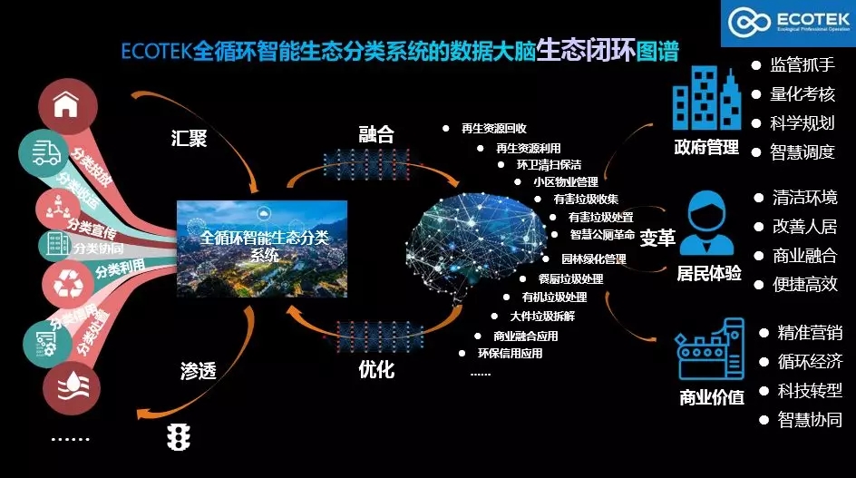 與此同時,行業(yè)技術(shù)從簡單的設(shè)備應(yīng)用發(fā)展至如今的互聯(lián)網(wǎng)+深度推廣模式。智慧環(huán)衛(wèi)的服務(wù)主體逐步向大眾傾斜,因此,專注于全循環(huán)智能分類的生態(tài)系統(tǒng)(ECOTEK)應(yīng)運而生。