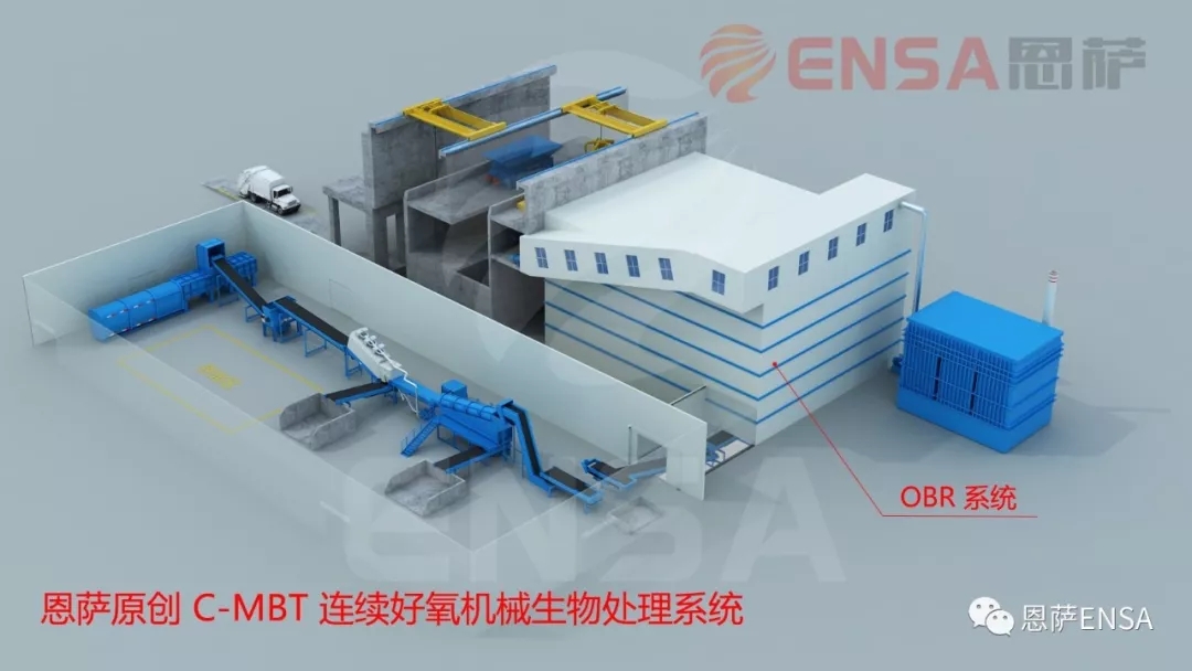 為解決上述問題,恩薩原創(chuàng)性地提出大規(guī)模智能連續(xù)好氧機械生物處理技術(shù)(以下簡稱“C-MBT”,即:Continuous Mechanical Biological Treatment),即采用 OBR 連續(xù)高效好氧生物反應器(恩薩專利)技術(shù)(以下簡稱“OBR”, 即:Oxic Bio-Reactor ),針對已經(jīng)過初步破碎預處理后的生活垃圾等物料,在封閉的環(huán)境下,以連續(xù)進出料和自動翻拋的方式持續(xù)好氧發(fā)酵的過程,從而在相對較短的發(fā)酵時間內(nèi)持續(xù)獲得較低含水率的高熱值物料。