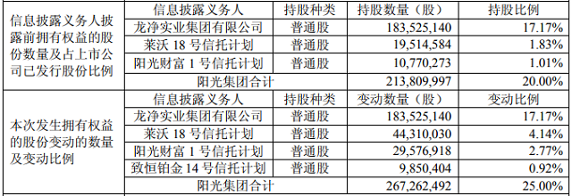 據(jù)了解,截至本公告日龍凈環(huán)保股東陽光集團在上海證券交易所通過集中交易方式完成0.53億股的增持。權(quán)益變動前陽光集團持股20%,權(quán)益變動后持股比例為25%。