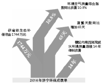 2016年,濟(jì)寧市環(huán)境空氣質(zhì)量綜合指數(shù)同比改善10.8%,改善幅度居全省第5位;“藍(lán)天白云、繁星閃爍”天數(shù)達(dá)245天,同比增加65天,增幅居全省首位,獲省級生態(tài)補償資金1744萬元。