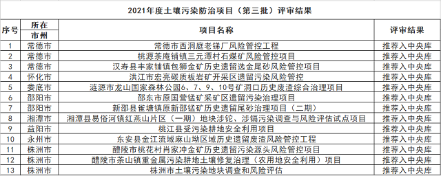湖南省生態(tài)環(huán)境廳關(guān)于2021年度土壤污染防治項(xiàng)目(第三批)、地下水污染防治項(xiàng)目(第二批)評(píng)審結(jié)果的公示 根據(jù)《土壤污染防治專項(xiàng)資金管理辦法》、《關(guān)于印發(fā)<中央生態(tài)環(huán)境資金項(xiàng)目?jī)?chǔ)備庫(kù)入庫(kù)指南>的通知》、《湖南省省級(jí)財(cái)政專項(xiàng)資金公開辦法(試行)》等有關(guān)要求,經(jīng)項(xiàng)目單位申請(qǐng)、市級(jí)環(huán)保部門審查、...