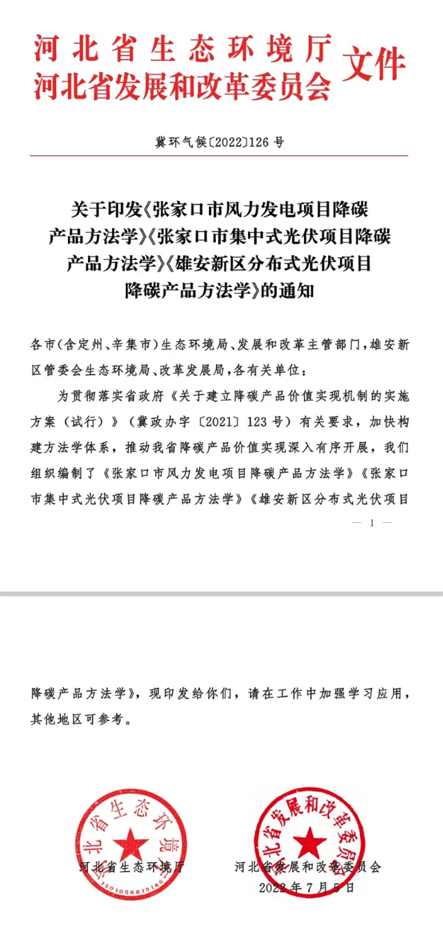 近日,由張家口市生態(tài)環(huán)境局組織編制的《張家口市風(fēng)力發(fā)電項(xiàng)目降碳產(chǎn)品方法學(xué)》和《張家口市集中式光伏項(xiàng)目降碳產(chǎn)品方法學(xué)》,獲河北省生態(tài)環(huán)境廳、河北省發(fā)展改革委聯(lián)合批準(zhǔn)發(fā)布實(shí)施,是2022年河北省首批發(fā)布的降碳產(chǎn)品方法學(xué),也是全國首個(gè)市級“綠電”降碳產(chǎn)品方法學(xué)。 今年以來,張家口市...