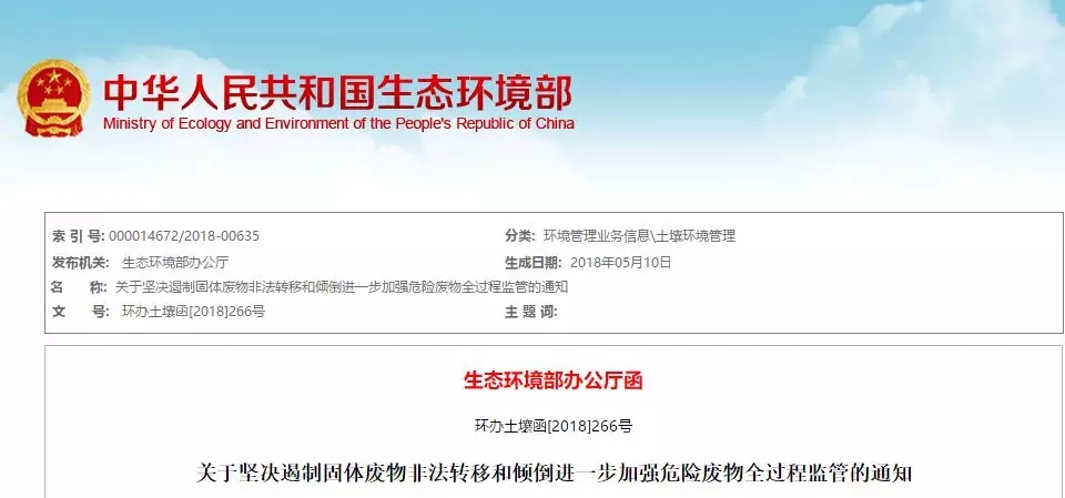2018年5月10日,生態(tài)環(huán)境部印發(fā)了《關(guān)于堅決遏制固體廢物非法轉(zhuǎn)移和傾倒 進(jìn)一步加強(qiáng)危險廢物全過程監(jiān)管的通知》(環(huán)辦土壤函〔2018〕266號,以下簡稱《通知》)。來源:生態(tài)環(huán)境部《通知》主要要求《通知》要求,各級生態(tài)環(huán)境部門要以習(xí)近平新時代中國特色社會主義思想為指導(dǎo),全面貫徹落實黨的十九大精神,...