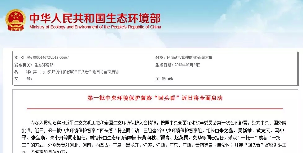 近日,第一批中央環(huán)境保護(hù)督察“回頭看”將全面啟動,對河北、河南,內(nèi)蒙古、寧夏,黑龍江,江蘇、江西,廣東、廣西,云南等省(自治區(qū))開展“回頭看”督察進(jìn)駐工作,進(jìn)駐時間約為1個月。來源:生態(tài)環(huán)境部近日,第一批中央環(huán)境保護(hù)督察“回頭看”將全面啟動,對河北、河南,內(nèi)蒙古、寧夏,黑龍江,江蘇、江西,廣東、廣西...