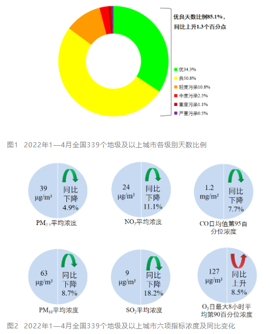 生態(tài)環(huán)境部5月18日向媒體通報(bào)了2022年4月和1—4月全國(guó)環(huán)境空氣質(zhì)量狀況。 環(huán)境空氣總體情況 4月,全國(guó)339個(gè)地級(jí)及以上城市平均空氣質(zhì)量?jī)?yōu)良天數(shù)比例為89.0%,同比下降3.5個(gè)百分點(diǎn);PM2.5平均濃度為28微克/立方米,同比持平;PM10平均濃度為56微克/立方米,同比上升3....