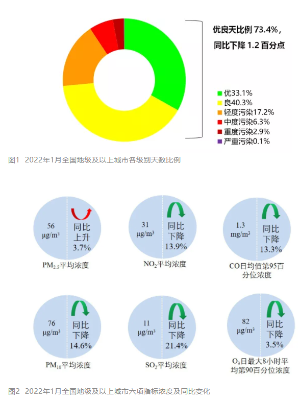 生態(tài)環(huán)境部今日向媒體通報(bào)了2022年1月全國環(huán)境空氣質(zhì)量狀況。 總體情況 1月,全國339個(gè)地級(jí)及以上城市平均空氣質(zhì)量優(yōu)良天數(shù)比例為73.4%,同比下降1.2個(gè)百分點(diǎn);PM2.5平均濃度為56微克/立方米,同比上升3.7%;PM10平均濃度為76微克/立方米,同比下降14.6%;O3平均濃度為82微...