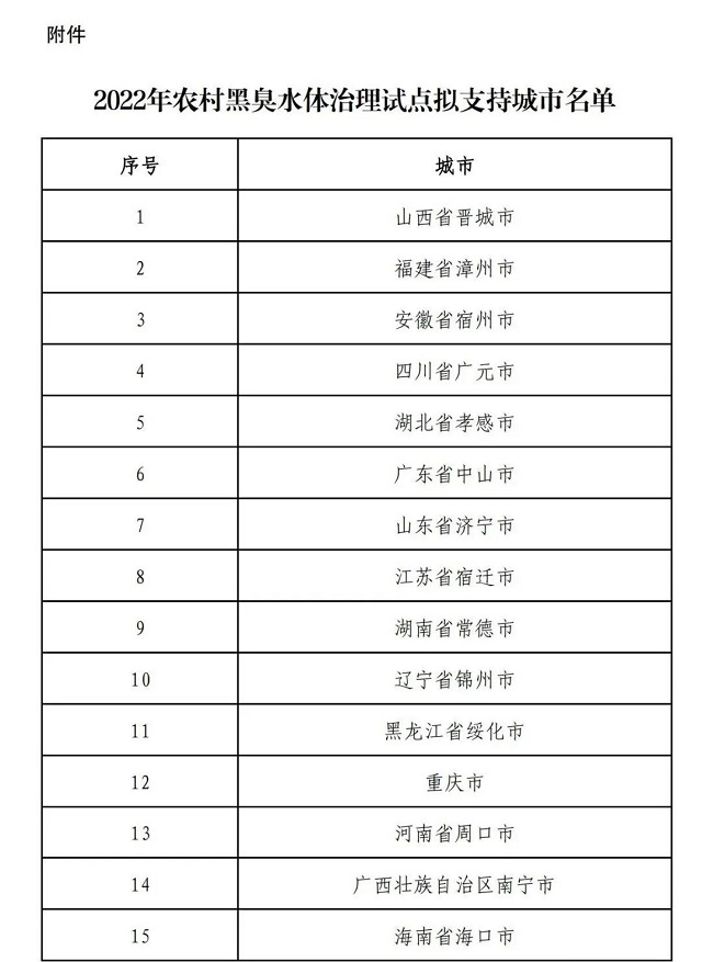 今年3月,財(cái)政部、生態(tài)環(huán)境部通知開展2022年農(nóng)村黑臭水體治理試點(diǎn)工作,6月10日,財(cái)政部對(duì)2022年農(nóng)村黑臭水體治理試點(diǎn)支持城市名單予以公示。文件擬將15個(gè)城市確定為2022年支持的農(nóng)村黑臭水體治理試點(diǎn)城市,包括山西晉城市、安徽宿州市、湖北孝感市、廣東中山市、重慶市等。 目前,該名單仍處于公示期內(nèi)...