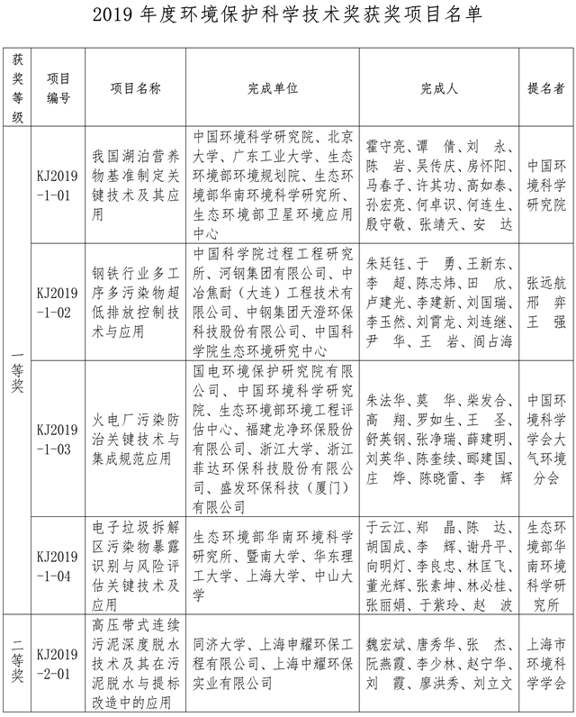 根據(jù)《環(huán)境保護(hù)科學(xué)技術(shù)獎(jiǎng)勵(lì)辦法》的規(guī)定,經(jīng)有關(guān)專(zhuān)家、單位提名和專(zhuān)家評(píng)審,并通過(guò)廣泛公示,環(huán)境保護(hù)科學(xué)技術(shù)獎(jiǎng)勵(lì)委員會(huì)批準(zhǔn)39個(gè)項(xiàng)目獲2019年度環(huán)境保護(hù)科學(xué)技術(shù)獎(jiǎng),其中:一等獎(jiǎng)4項(xiàng),二等獎(jiǎng)33項(xiàng),科普類(lèi)獎(jiǎng)2項(xiàng)。 附:2019年度環(huán)境保護(hù)科學(xué)技術(shù)獎(jiǎng)獲獎(jiǎng)項(xiàng)目名單 環(huán)境保護(hù)科學(xué)技術(shù)獎(jiǎng)勵(lì)辦公室 2019年12...