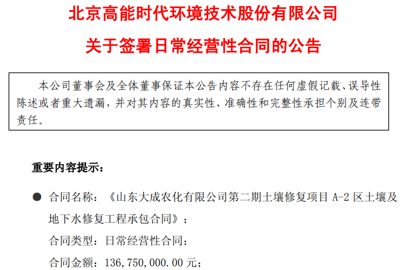 中國水網獲悉,5月22日,北京高能時代環(huán)境技術股份有限公司(以下簡稱“高能環(huán)境”或“公司”)發(fā)布公告稱,公司于近日簽署《山東大成農化有限公司第二期土壤修復項目 A-2 區(qū)土壤及地下水修復工程承包合同》,合同金額月1.37億。據悉,工程內容包括編制完整的修復工程施工方案,經專家評審后,報淄博市環(huán)保局備...