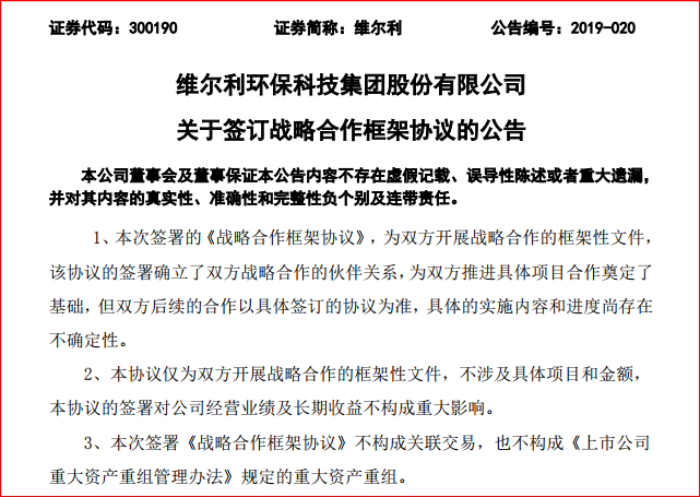 2019年3月18日,維爾利環(huán)??萍技瘓F股份有限公司(簡稱“維爾利環(huán)保”)發(fā)布公告稱,公司近期與常高新集團有限公司(簡稱“常高新”)簽訂了《戰(zhàn)略合作框架協(xié)議》,共同深耕常州環(huán)保市場。 公告指出,本次合作將以項目、資本、技術、研發(fā)、產(chǎn)品、綜合金融服務為紐...